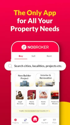 Не само сделки с имоти – NoBroker предлага и набор от услуги за улесняване на живота ви. Насладете се на незабавни договори за наем или лизинг с доставка в рамките на ден, както и точна оценка на стойността и наема на вашия имот. Плащайте наема си онлайн с кредитна карта, събирайки награди и кешбек за жилищни, търговски наеми, такси за обучение, депозити и абонаментни такси. Освен това, приложението ви дава достъп до широк спектър от домашни услуги: от професионално боядисване, почистване и дезинфекция, до сервиз и ремонт на климатици и услуги от електротехници, дърводелци и водопроводчици. Завършете визията на мечтания дом с консултации от водещи интериорни дизайнери чрез NoBroker Interior Design.