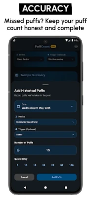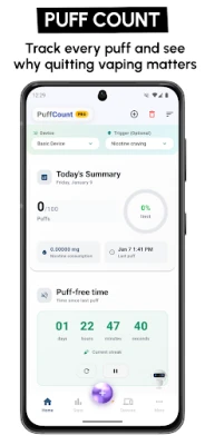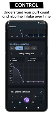 **Quit Smoking App** ви предлага цялостна система за проследяване и контрол. С нашия иновативен Брояч на дръпванията можете прецизно да регистрирате всяко вдишване, добивайки ясна представа за дневната си консумация. Проследявайте своя напредък с детайлни истории и изграждайте последователни серии от дни без употреба, които ще укрепят вашата решимост. Разберете по-добре какво провокира желанието ви чрез функцията за тригери и устройства, за да можете ефективно да управлявате тези моменти. А с Калкулатора за никотин автоматично измервате приема си, докато персонализираният План за отказване ви води стъпка по стъпка към трайно освобождение от навика. Допълнително, подробната статистика по дни, седмици и месеци, както и удобните теми и уиджети за началния екран, осигуряват лесен достъп до важна информация и поддържат мотивацията ви висока.