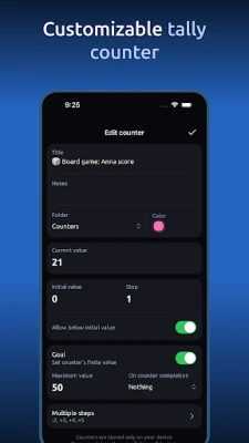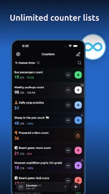 Поддържайте безупречен ред с интелигентните опции за организация на Tally Counter. Групирайте вашите броячи в папки и архивирайте старите, за да запазите работната си среда чиста. Намерете всеки брояч мигновено чрез функцията за търсене и сортирайте по име, дата или стойност. Инструментът за копиране улеснява дублирането на броячи или цели папки, спестявайки време. Tally Counter предоставя и пълна персонализация: задайте уникални цветове, начални стойности и персонализирани стъпки.